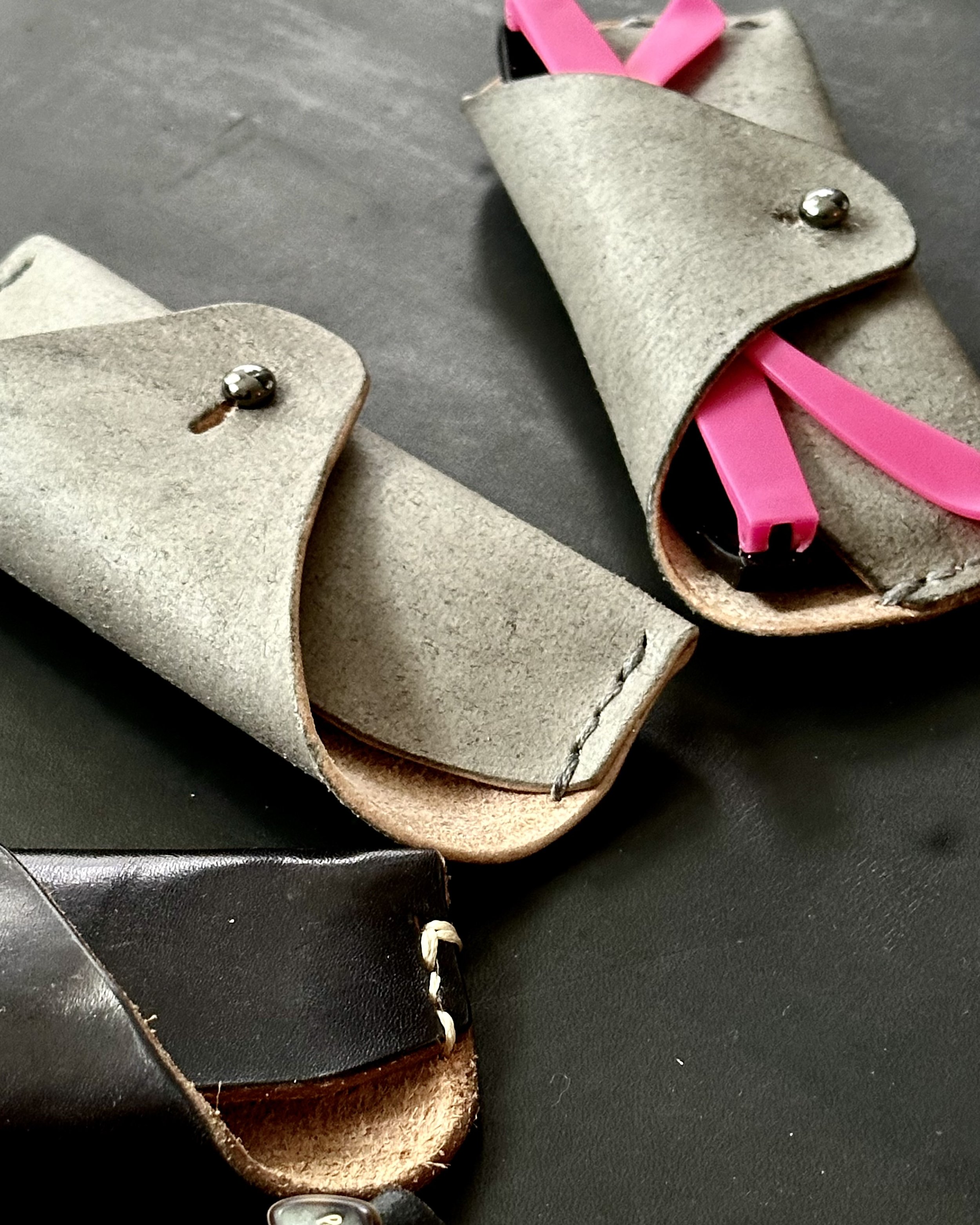 Glasses cases in all colors of the rainbow. The leather is vegetable tanned either as full grain with a smooth surface (Natural, Black or Brown) or as a slicked and waxed rough-out version (Black, Grey, light Beige and Tan). Some of these are brand new and others are already a few years old and have developed a beautiful patina. The closure hardware is available in either solid brass, chrome, black chrome or antique brass. Saddle-stitched by hand with waxed thread.